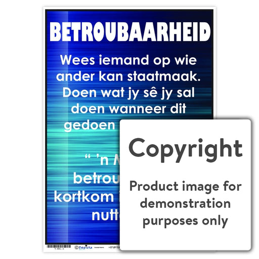 Wall Charts and PostersCode: V-REL-AOriginal price R 35.00 - Original price R 35.00Original priceR 35.00R 35.00 - R 35.00Current price R 35.00| /Full colour wall chart / poster depicting the value, Reliability, in Afrikaans " Betroubaarheid ". This chart defines the word and quotes Confucius...