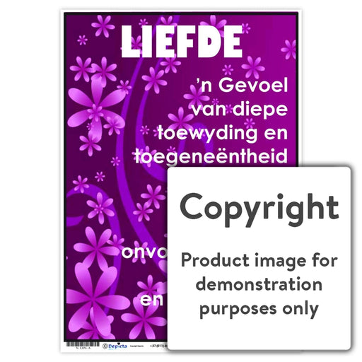 Wall Charts and PostersCode: V-LOV-AOriginal price R 35.00 - Original price R 35.00Original priceR 35.00R 35.00 - R 35.00Current price R 35.00| /Full colour wall chart / poster depicting and defining the word Love, in Afrikaans.