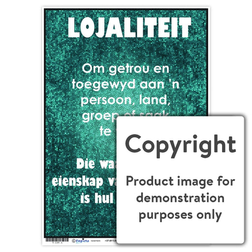 Wall Charts and PostersCode: V-LOY-AOriginal price R 35.00 - Original price R 35.00Original priceR 35.00R 35.00 - R 35.00Current price R 35.00| /Full colour wall chart / poster depicting the value, Loyalty, in Afrikaans. This chart defines the word and quotes by David Mamet on being loyal.