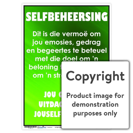 Wall Charts and PostersCode: V-SEL-AOriginal price R 35.00 - Original price R 35.00Original priceR 35.00R 35.00 - R 35.00Current price R 35.00| /Full colour wall chart / poster depicting the value, self-control, in Afrikaans " Selfbeheersing ". This chart defines the term and states "Your gr...