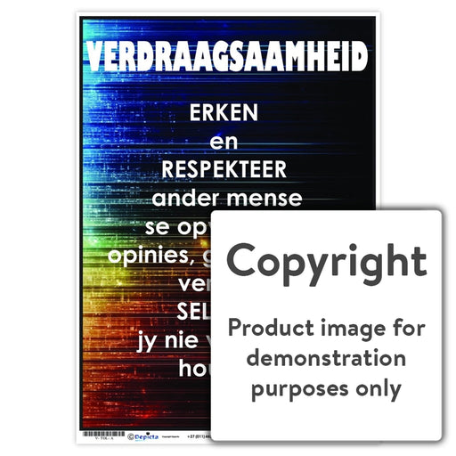 Wall Charts and PostersCode: V-TOL-AOriginal price R 35.00 - Original price R 35.00Original priceR 35.00R 35.00 - R 35.00Current price R 35.00| /Full colour Afrikaans wall chart / poster defining the value - Tolerance, "Verdraagsaamheid ".