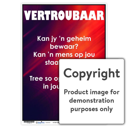 Wall Charts and PostersCode: V-TRU-AOriginal price R 35.00 - Original price R 35.00Original priceR 35.00R 35.00 - R 35.00Current price R 35.00| /Full colour Afrikaans wall chart / poster describing the value of being trustworthy "vertroubaar ".