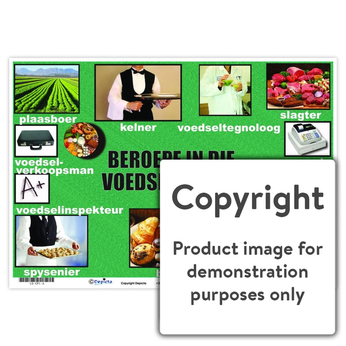 Full colour Afrikaans wall chart / poster depicting pictures and the names of different careers in the food industry " Beroepe in die Voedselbedryf ".