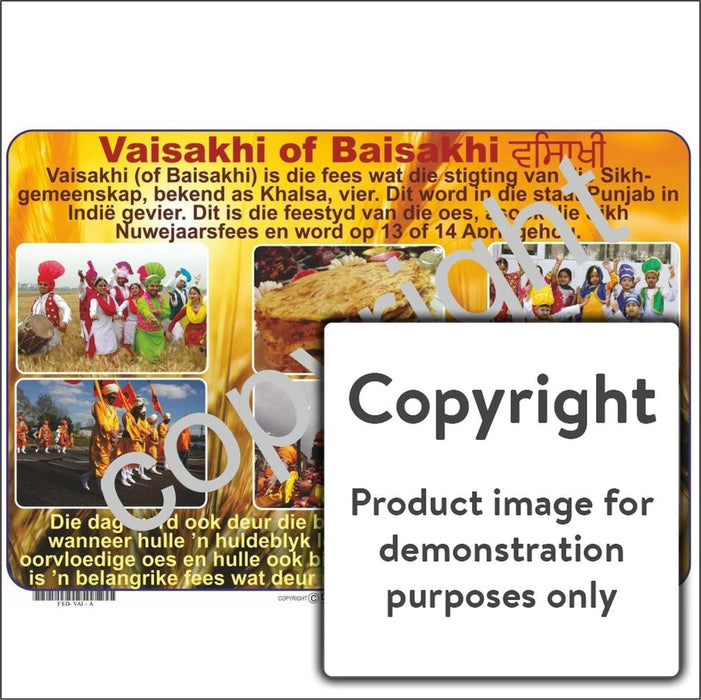 Full colour Afrikaans wall chart / poster depicting Vaisakhi or Baisakhi.  This festival celebrates the founding of the Sikh community and is celebrated in Punjab in India.