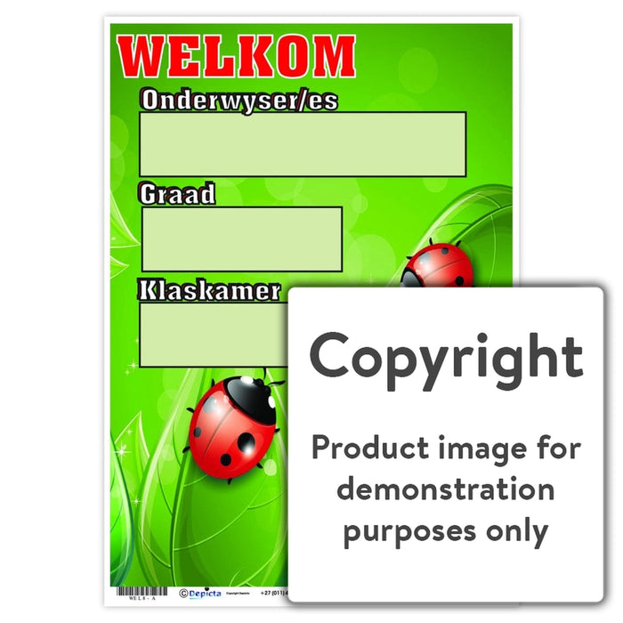 Full colour Welcome Chart with a cartoon picture of three ladybirds on 3 different leaves. This chart contains 3 blocks to write the teachers name " onderwyser/es ", the grade " graad " and the classroom " klaskamer ", in Afrikaans " Welkomkaart "